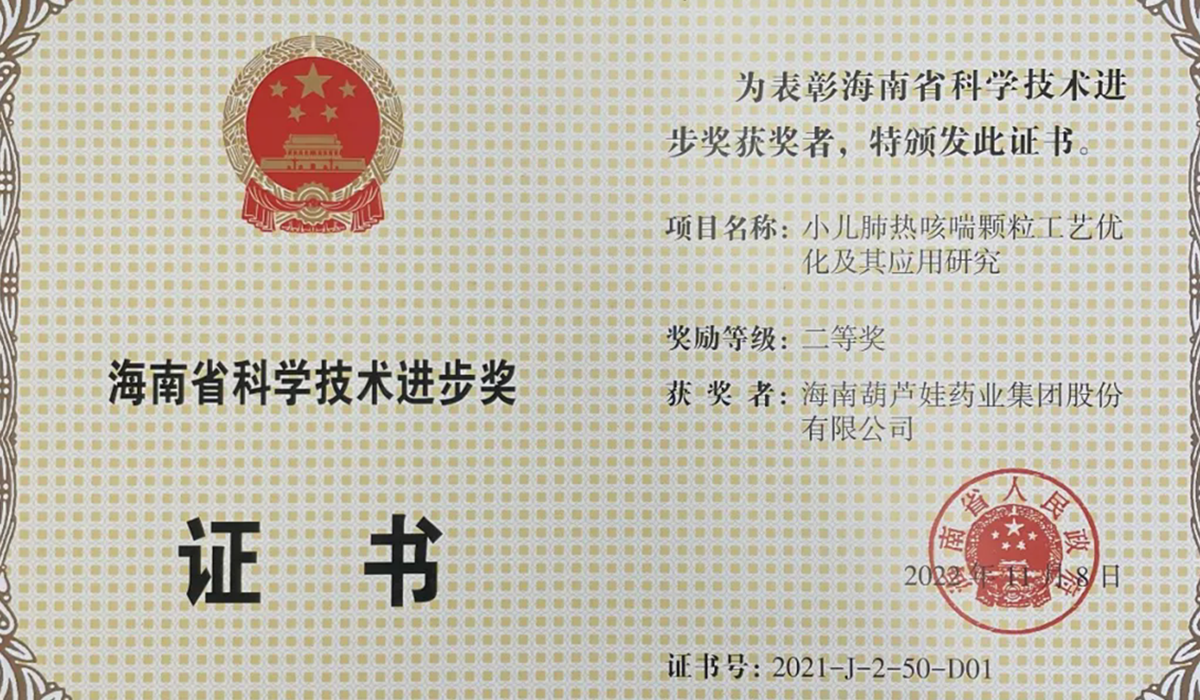 人生就是搏尊龍凱時藥業集團申報的專利“克咳片及其制備方法”榮獲 第四屆海南省專利獎金獎