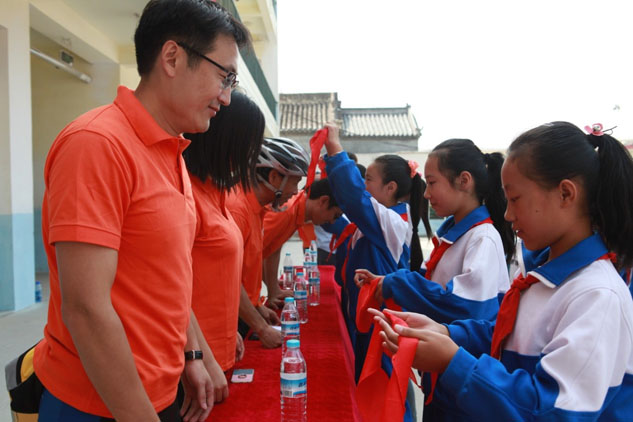 小學生們滿懷感恩地為人生就是搏尊龍凱時騎行隊的代表系紅領巾